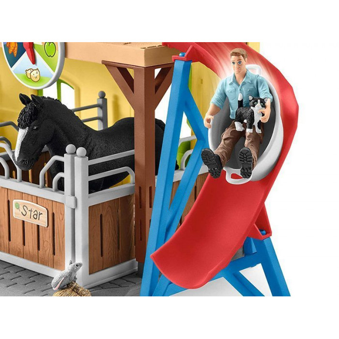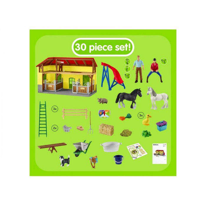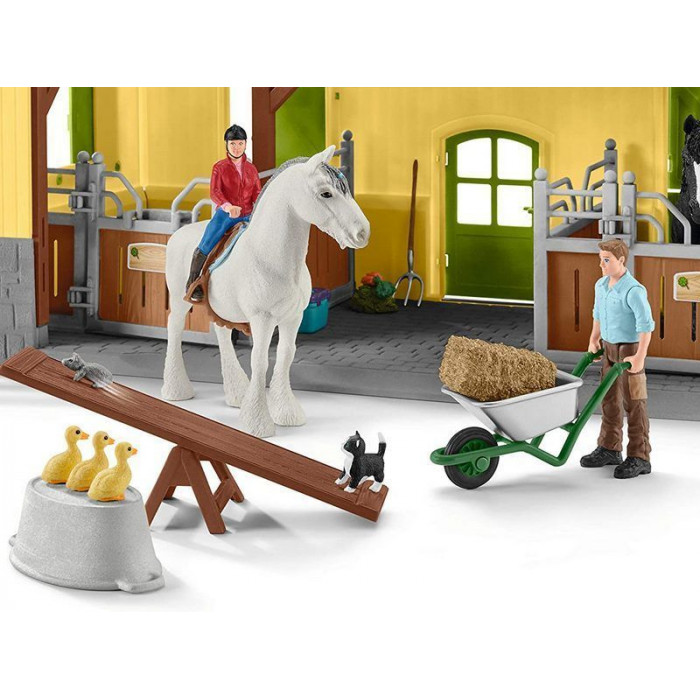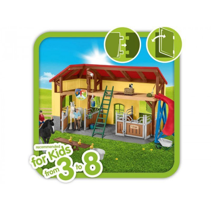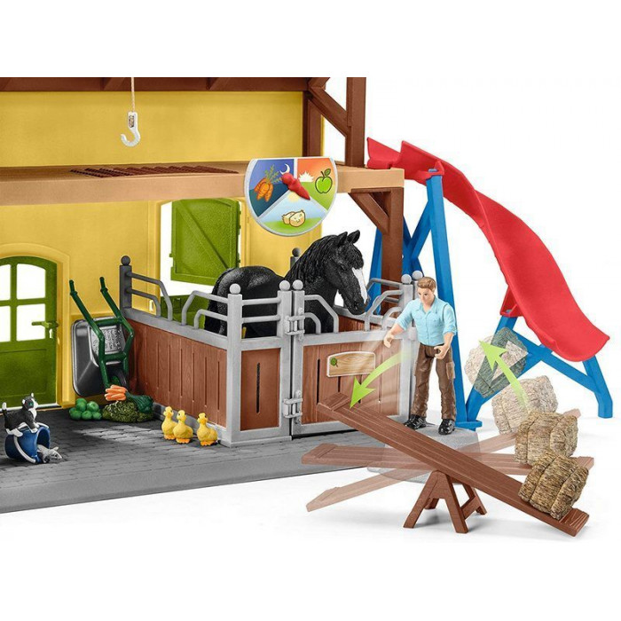 Конюшня Schleich с разными интересными функциями подарит детям много удовольствия от игры! Фермер Пауль и фермерша Лаура, 7 милых животных, 2 стойла и другие принадлежности для работы в конюшне позволят ребенку внести разнообразие в игру.