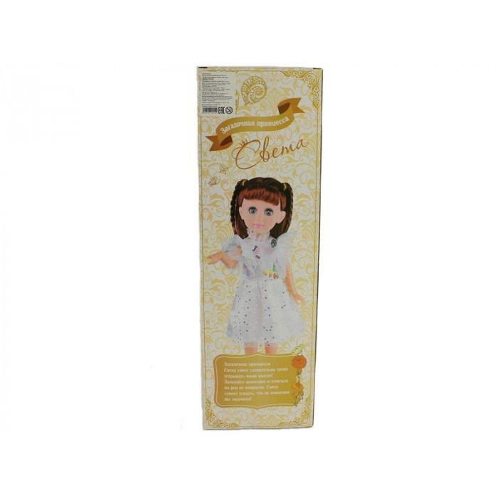 Интерактивная кукла - загадочная принцесса Света - станет любимой подружкой девочки. Кукла одета в красивое нарядное платье и умеет разговаривать. Волосы заплетены в косички, но при желании их можно расчесывать и придумывать новые прически. У Светы подвижны руки и ноги.