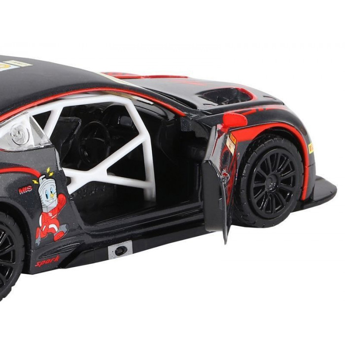 Модель выполнена в масштабе 1:32, у нее открываются двери, капот. Яркий спортивный дизайн, спойлер, обтекаемая форма кузова, спортивный обвес придают суперкару стремительный внешний вид. Колеса с резиновыми покрышками и литыми дисками, детально проработанный салон и моторный отсек, фары, прозрачные окна - всё как у настоящего автомобиля.