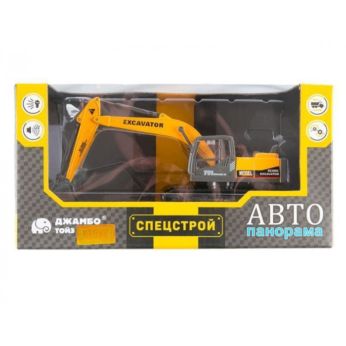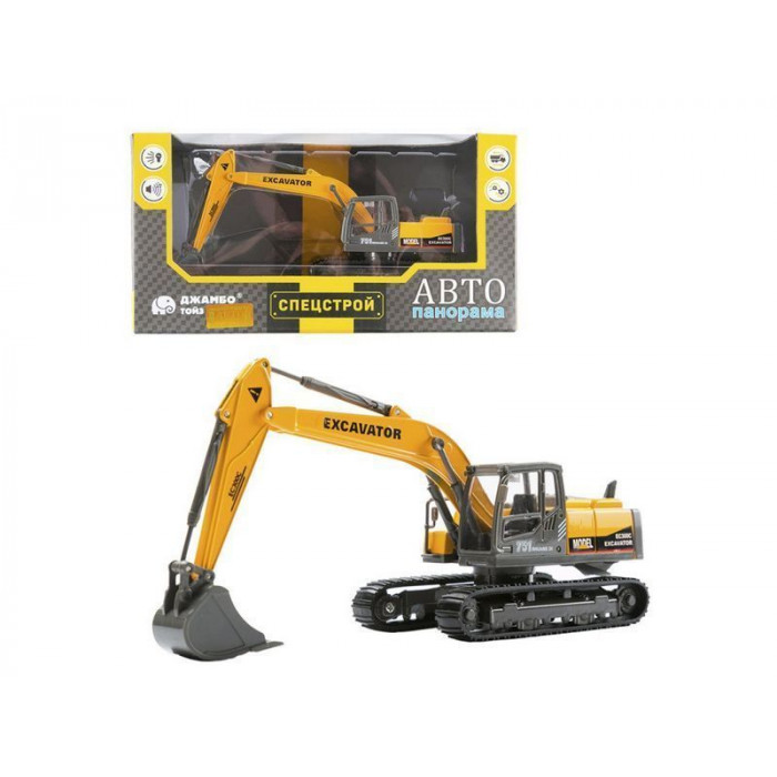 Описание Машина "АВТОПАНОРАМА" ЭКСКАВАТОР НА ГУСЕНИЦАХ, 1/50, желтый, свет, звук, в/к 25*10*13 см