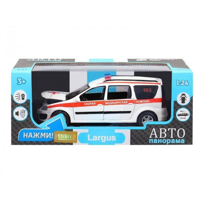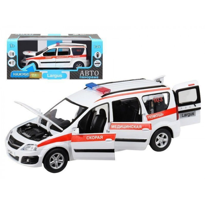 Вопросы и ответы (FAQ) Машина "АВТОПАНОРАМА" LADA LARGUS "Скорая помощь", 1/24, свет, звук, инерция, в/к 24,5*12,5*10,5 см