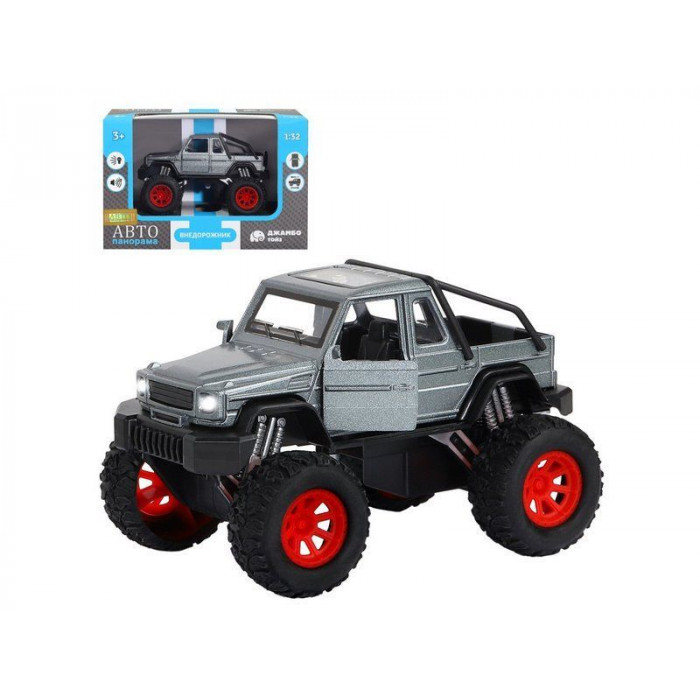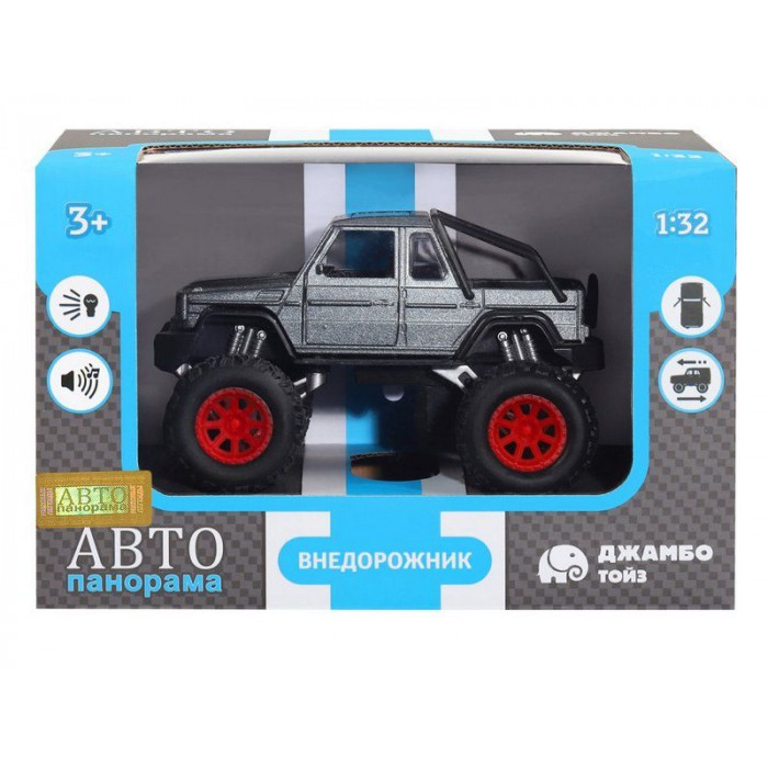 Основные характеристики Машина "АВТОПАНОРАМА" "Внедорожник",серый, 1/32, свет, звук, инерция, в/к 19*10*12,5 см