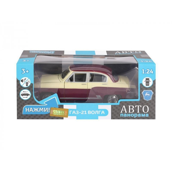 Описание Машина "АВТОПАНОРАМА" Волга ГАЗ-21 "Двухцветная", бежево-коричневый, 1/24, в/к 26*12*11 см