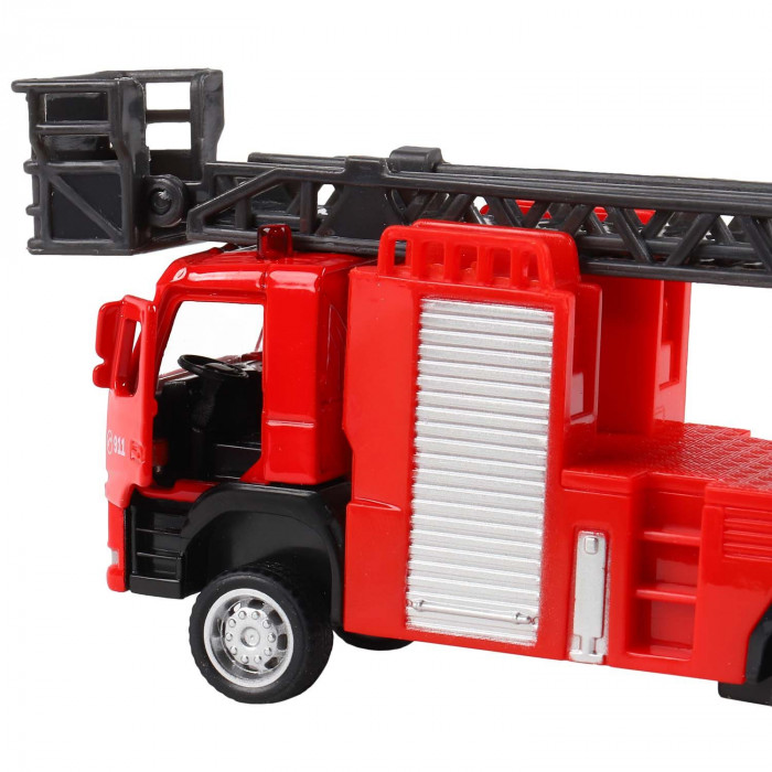 Модель выполнена в масштабе 1:72, хорошо детализирована, имеет крепкий корпус, у нее открываются двери в кабине и есть подвижные элементы. Колеса с резиновыми покрышками, прозрачные окна, тематические надписи, "мигалки", лестница с люлькой - всё как у настоящего автомобиля.