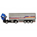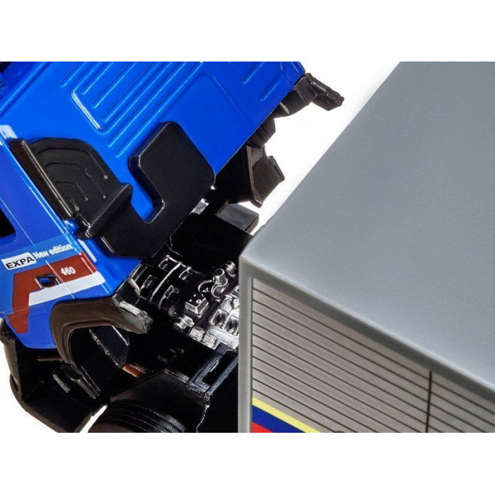 Модель выполнена в масштабе 1:50, имеет подвижные элементы, у нее откидывается кабина, как у настоящей техники. Свободный ход колес позволяет катать игрушку практически по любой поверхности. Если нажать на корпус, загорятся фары, мигалки и включится звук мотора.