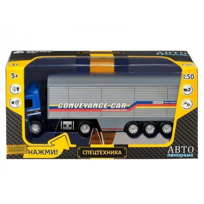 Основные характеристики Машина "АВТОПАНОРАМА" Volvo, синий, 1/50, свет, звук, в/к 28*14*10 см
