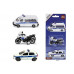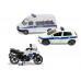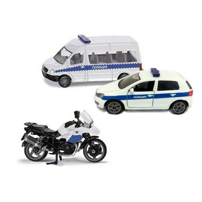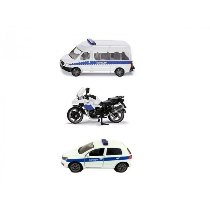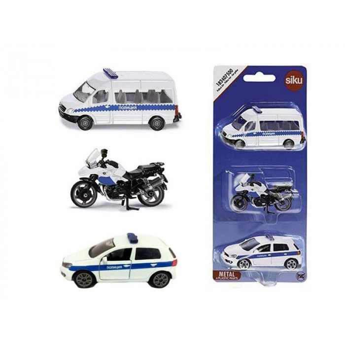 Набор полицейских машинок от немецкой компании Siku для любителей машинок и коллекционеров. Модельки выполнены из металла с использованием высококачественного пластика, лобовое и боковые стёкла из прозрачной пластмассы, колёса выполнены из резины и вращаются, можно катать. На крыше - мигалки. По бокам отличительные знаки.
