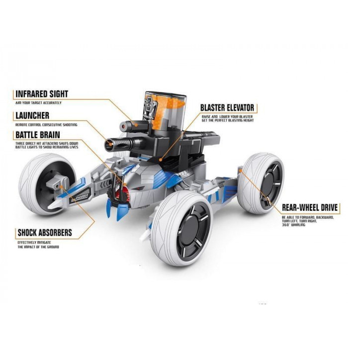 Робот стреляет пластиковыми пульками, расположенными в специальной обойме с автоматической зарядкой боевой пушки. На роботе расположена броня, которая отваливается при попадании в нее, а после трех успешных попаданий в робота, он выходит из строя. Для того чтобы вновь вернуться в игру необходимо перезапустить боевую машину. На моделе установлена светодиодная подсветка с индикацией вашей жизни, которая проинформирует вас сколько попаданий осталось до отключения вашего робота. Заднеприводные колеса позволяют двигаться во всех направлениях и делать повороты на 360°. Для более плавной езды робот оборудован амортизаторами. А для еще большей реалистичности игрового процесса, робот оснащен звуковыми эффектами.