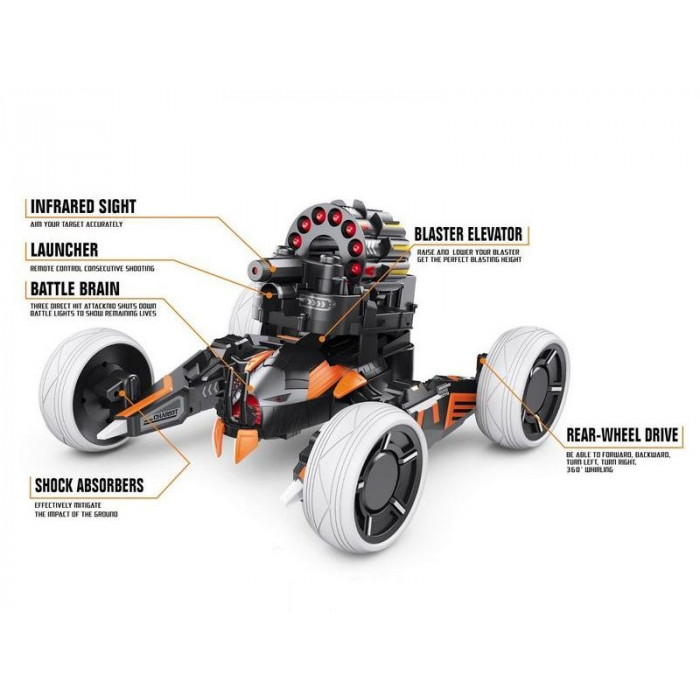 Робот стреляет пластиковыми ракетами, расположенными в специальной обойме с автоматической зарядкой боевой пушки. На роботе расположена броня, которая отваливается при попадании в нее, а после трех успешных попаданий в робота, он выходит из строя. Для того чтобы вновь вернуться в игру необходимо перезапустить боевую машину. На моделе установлена светодиодная подсветка с индикацией вашей жизни, которая проинформирует вас сколько попаданий осталось до отключения вашего робота. Заднеприводные колеса позволяют двигаться во всех направлениях и делать повороты на 360°. Для более плавной езды робот оборудован амортизаторами. А для еще большей реалистичности игрового процесса, робот оснащен звуковыми эффектами.