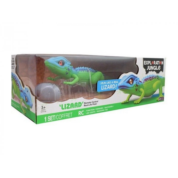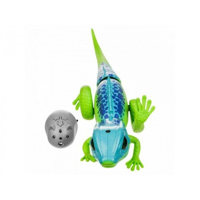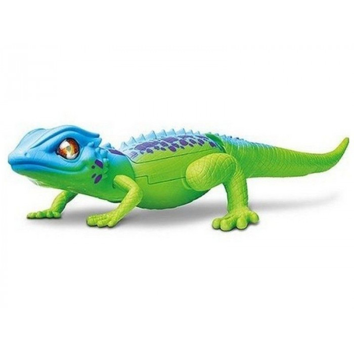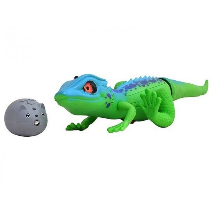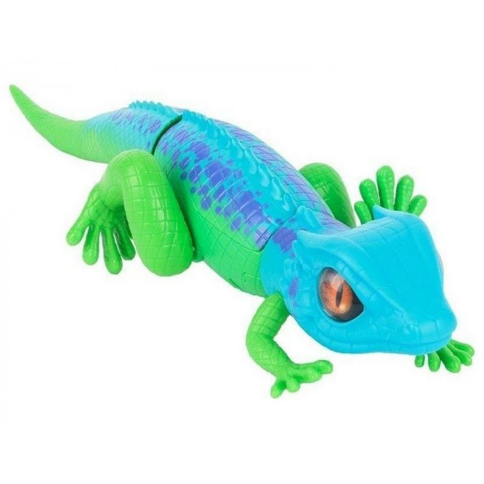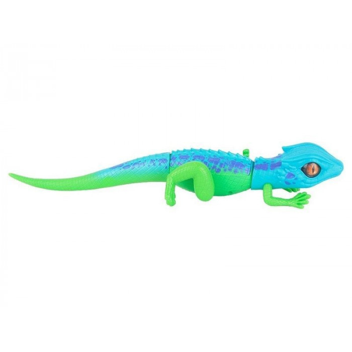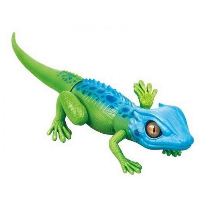 Интерактивная робот-ящерица зеленого-голубого окраса на инфракрасном управлении. Зелено-голубой окрас имитирует окрас настоящей игуаны. У нее большая голова и четыре короткие подвижные лапки.