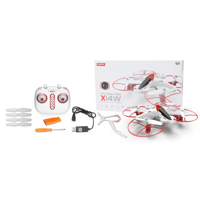 Квадрокоптер Syma X14WPRO от компании Syma. Версия Pro имеет на борту FPV камеру для трансляции полета в режиме реального времени. Корпус дрона выполнен из прочного и ударостойкого пластика, что является плюсом этом модели. Специально для новичков в комплекте к квадрокоптеру есть защита лопастей.