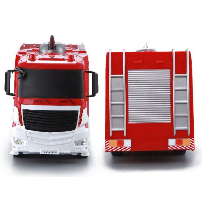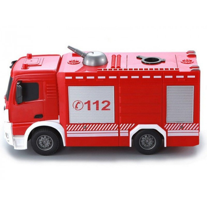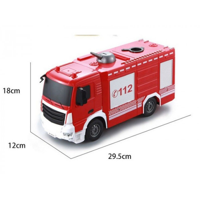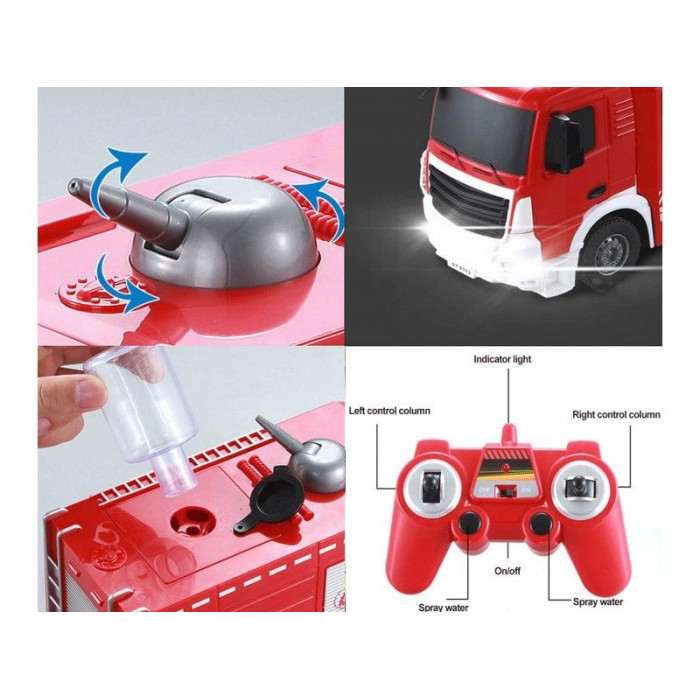 Машинка имеет световые эффекты - мигалку сине-красного цвета и звуковую пожарную сигнализацию. Но и это еще не все. В машинку можно залить воды в специальное отверстие и тогда она сможет, как настоящая пожарная машина, выпускать стрелу воды для тушения пожара.