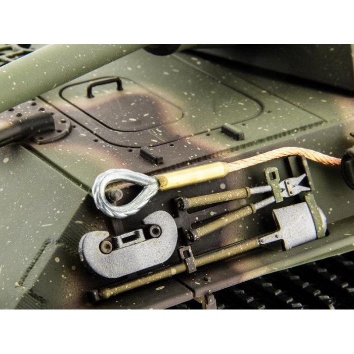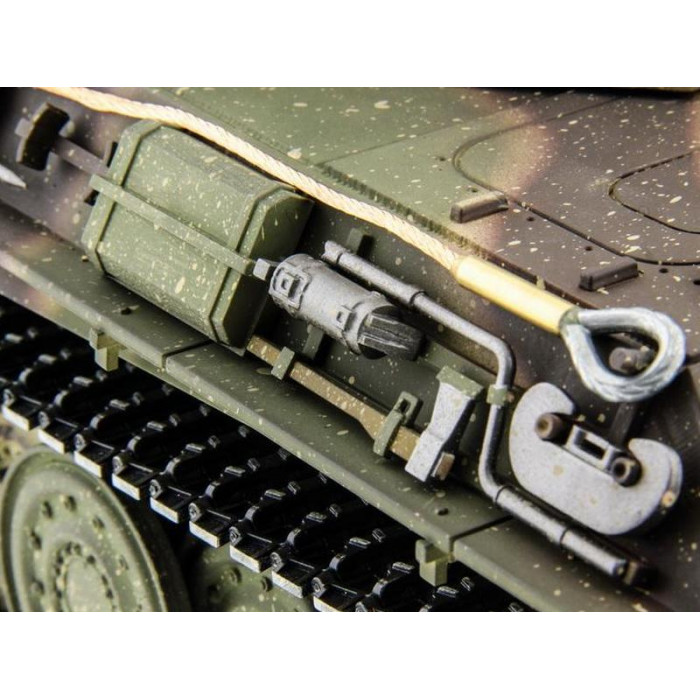 Эта новая обновленная версия поставляется с аппаратурой управления 2,4 ГГц, которая имеет много преимуществ - расширенный диапазон, защита от помех и точность рулевого управления. Еще одна очень полезная функция - звук на этой машине. Звуковой генератор имеет 2 канала и может выдавать 2 звука одновременно - звук стрельбы и звук двигателя. Генератор дыма (дым из глушителя) добавляет реализм танку Panther type F.