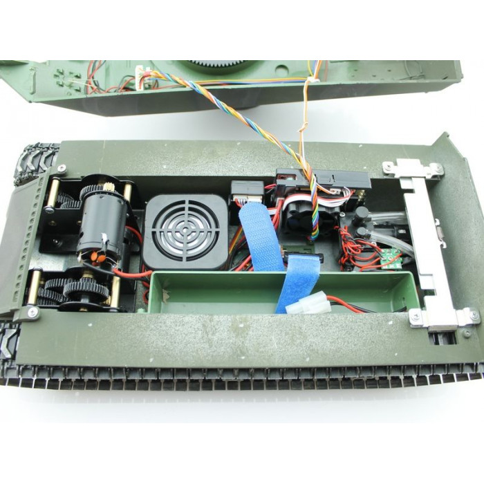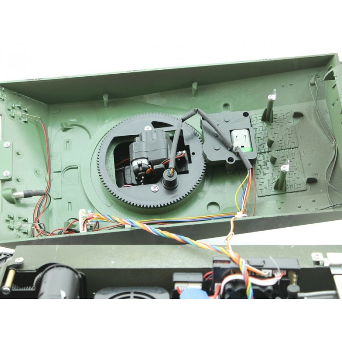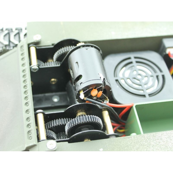 Модель полностью готова к работе, филигранно раскрашена и имеет все необходимые аксессуары для эксплуатации. Выхлопные трубы оборудованы дым - системой, движение модели сопровождается звуковой имитацией работы двигателя! На модели светятся фары, и вращается башня влево/вправо в секторе 360°, ствол откланяется вверх/вниз. При выстреле имитируется «отдача» и звук орудия, а работающая подвеска катков, лязг гусениц заставляют поверить в реальность происходящего!