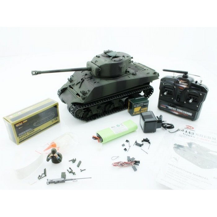 Радиоуправляемый танк Torro Sherman M4A3 с большой башней, оснащённой 76 мм пушкой, в масштабе 1:16 с пневматической пушкой, дымовыми и звуковыми эффектами - полностью функциональная модель, имеющая высокий уровень детализации и металлические компоненты.