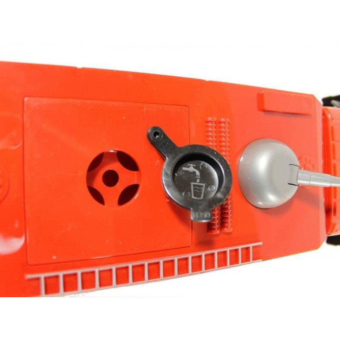 Машинка имеет световые эффекты - мигалку сине-красного цвета и звуковую пожарную сигнализацию. Но и это еще не все. В машинку можно залить воды в специальное отверстие и тогда она сможет, как настоящая пожарная машина, выпускать стрелу воды для тушения пожара.