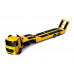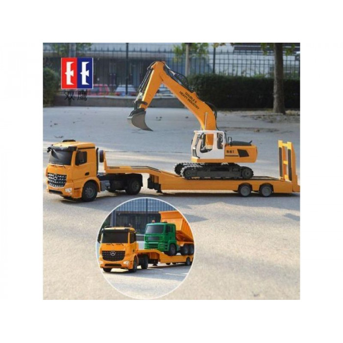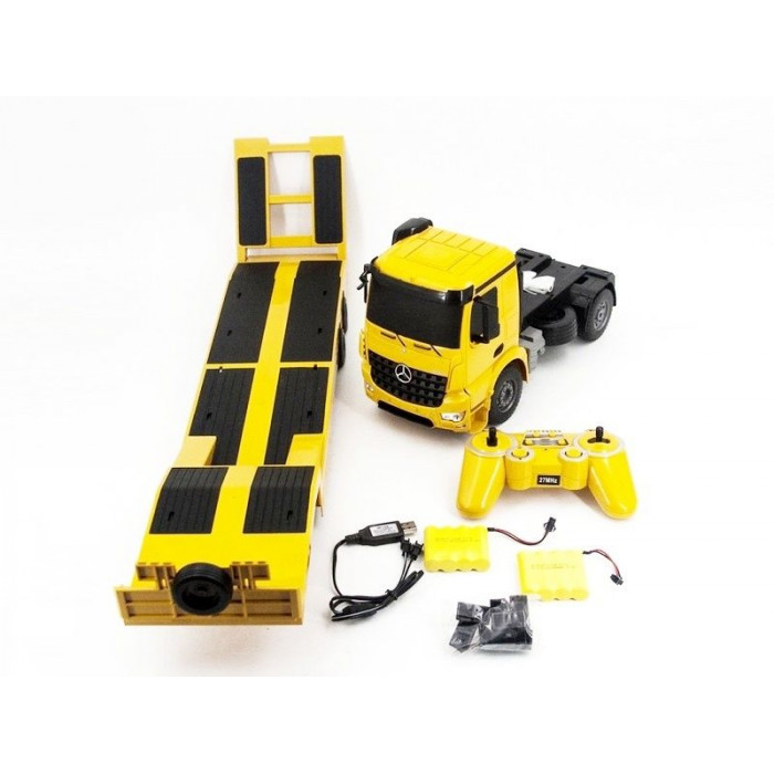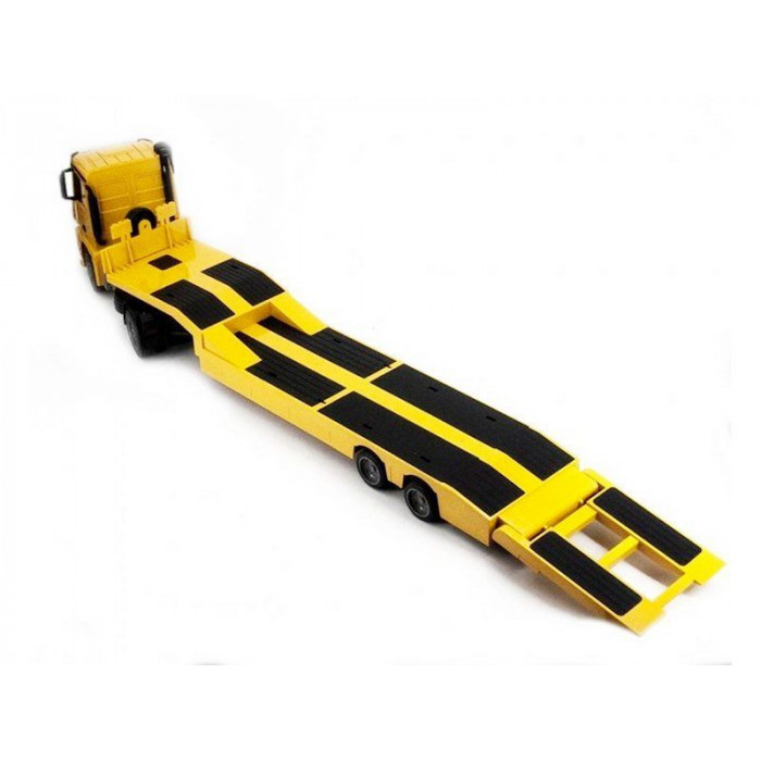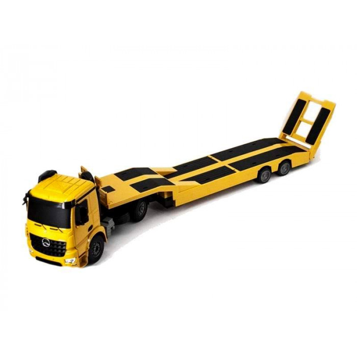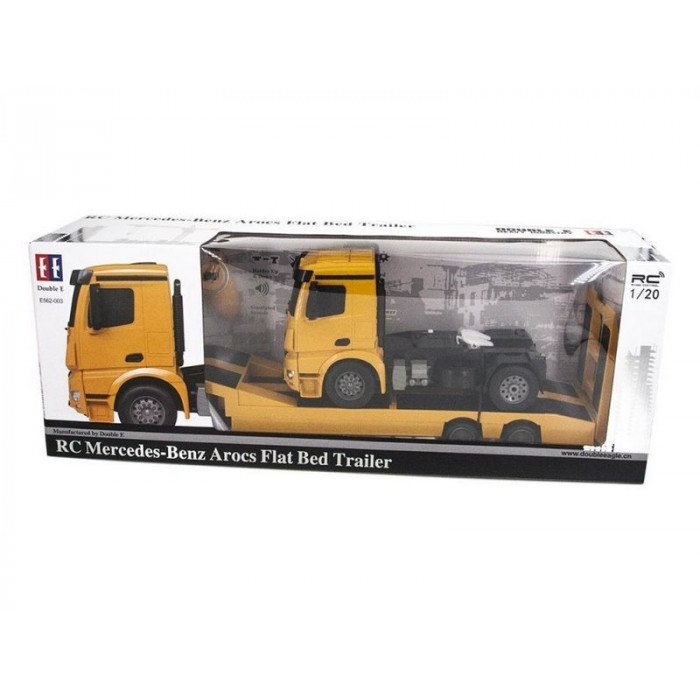 Лицензионная копия автовоза фирмы Mercedez-Benz от компании Double Eagle. Корпус модели полностью повторяет оригинальную машину: яркий жёлтый кузов и большие колёса. Кузов выполняет свою реальную функцию — платформа для заезда автомобилей опускается и поднимается. А ещё машинка издаёт реалистичные звуки работающего двигателя. Длина модели составляет 36 см.