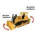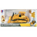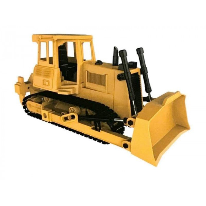 Бульдозер имеет строительный желтый стиль. Он полностью выполнен из прочного пластика, четыре электромотора обеспечивают движение вперед и назад, повороты влево и вправо, а так же для движения ковшом и вилами разрыхлителя.