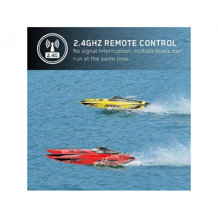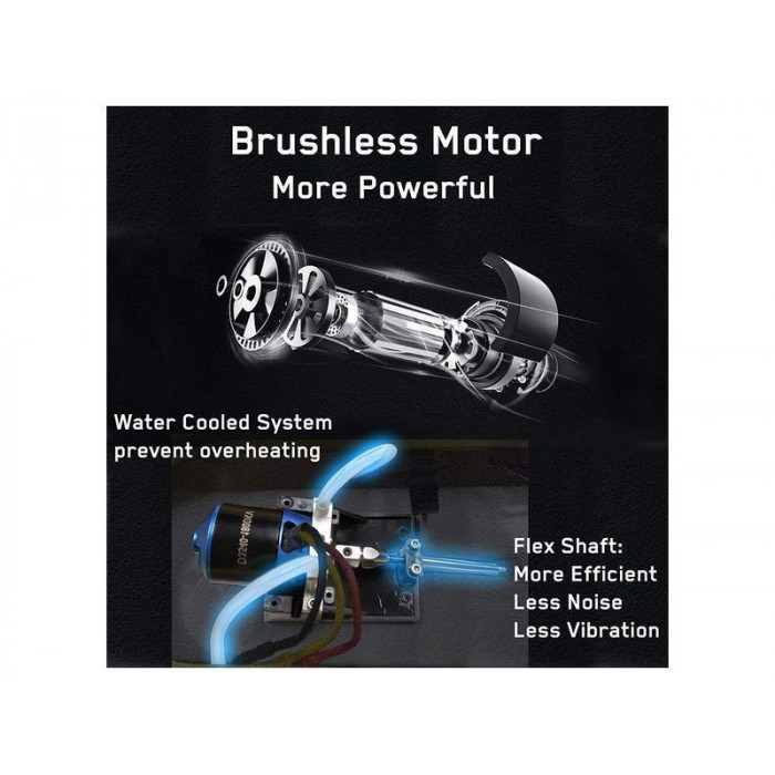 Катер оборудован современной электроникой: аппаратура управления с помехозащищенной частотой 2.4GHz. Система водяного охлаждения предотвращает перегрев двигателя. Катер замедляется при низком напряжении для защиты аккумулятора и лодки, напоминая вам о необходимости немедленно забрать ее обратно.