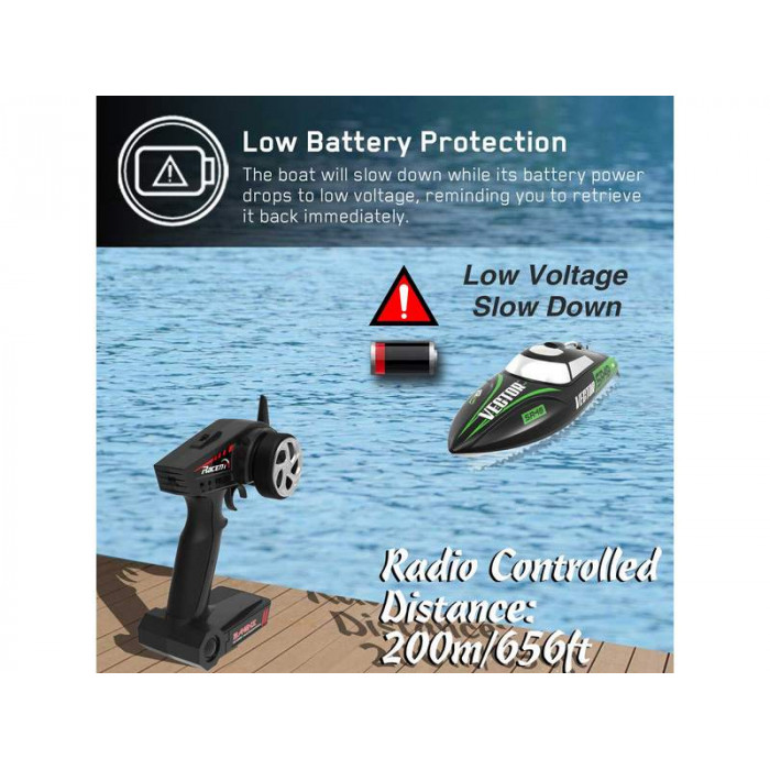 Защита от низкого напряжения будет замедлять катер при низком заряде батареи, чтобы вы смогли немедленно вернуть его обратно. Функция безопасности защитит аккумулятор от перезарядки и чрезмерной разрядки аккумулятора. Конструкция системы водяного охлаждения снижает температуру двигателя и предотвращает его перегрев.