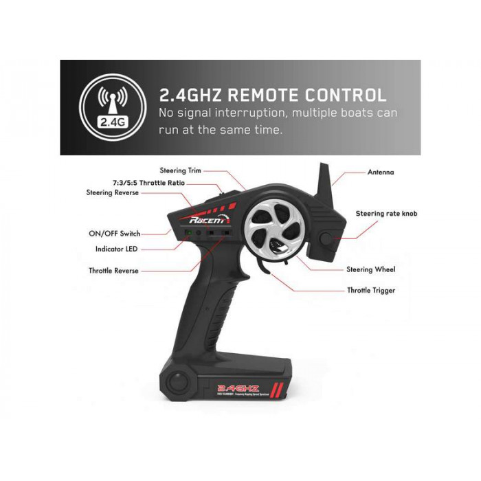 Функция восстановления при опрокидывании позволяет автоматически быстро перевернуть катер с пульта дистанционного управления и вернуться к гонке). Функция реверса позволяет катеру двигаться вперед и назад, поворачивать влево и вправо, а пульт дистанционного управления может заставить лодку делать очень крутые повороты.