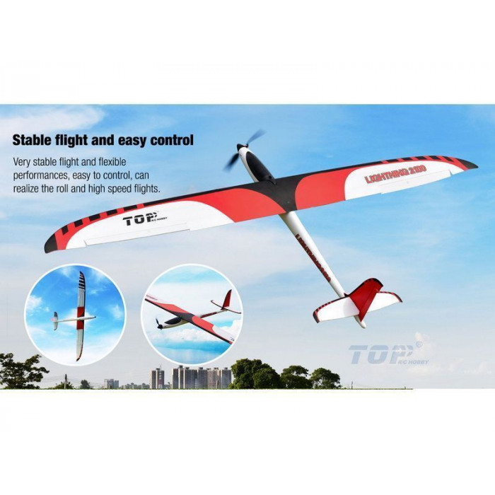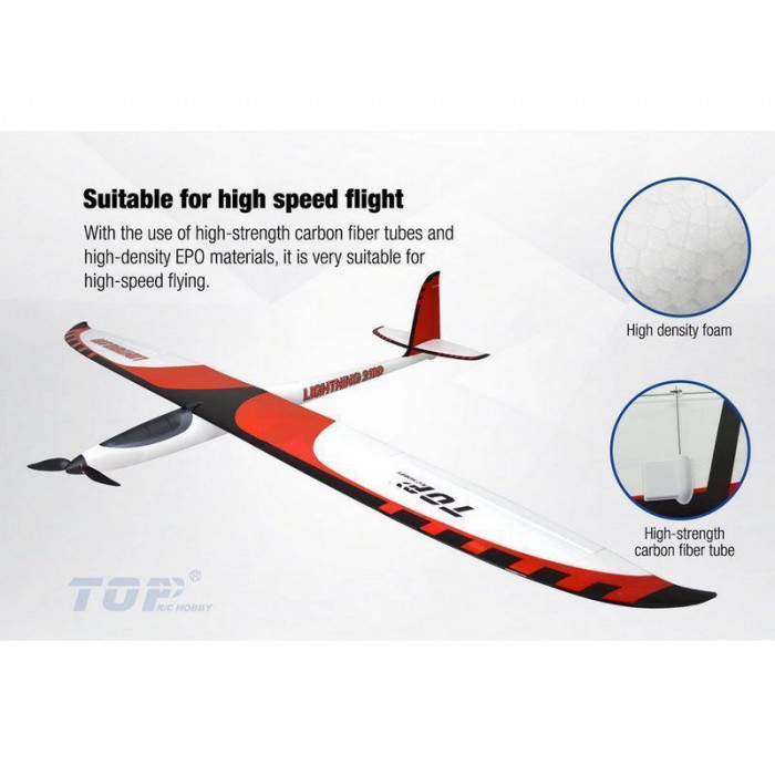 Высокоскоростной планер TOP RC Hobby Lightning 2100 порадует всех, кто хочет иметь быстрый и маневренный моторный планер в стиле "hotliner". Изготовленный из почти небьющегося материал EPO с дополнительно укрепленными углеволокном крыльями и основой планер обладает необходимой прочностью для высокоскоростных полетов.