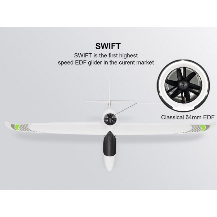 Планер TOP-RC Swift имеет размах крыльев 1200 мм и мощную силовую установку EDF. Все это позволяет ему развивать скорость до 160 км/ч. Большой размах крыльев и оригинальная конструкция дает возможность планеру легко маневрировать в воздушных потоках.