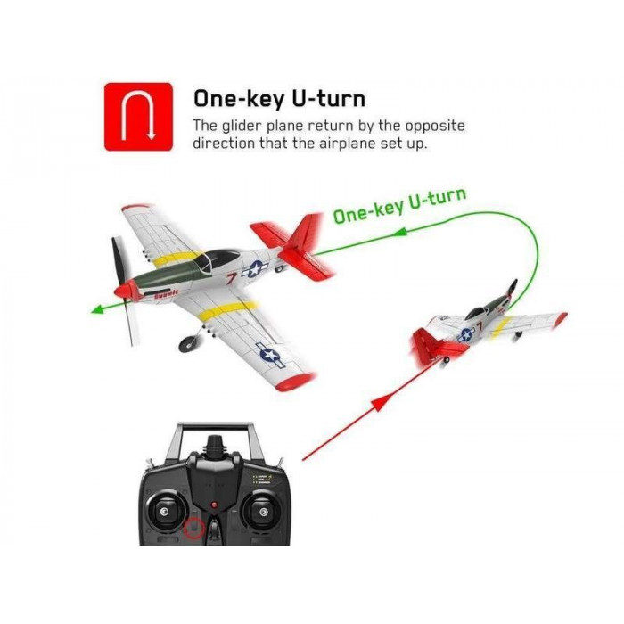 Функция разворота одним нажатием кнопки позволяет планеру вернуться в противоположном направлении от взлетающего самолета. Вы просто активируете функцию разворота до того, как самолет на радиоуправлении взлетит, и нажимаете кнопку «Разворот» во время полета, самолет автоматически улетит обратно с включенным гироскопом.